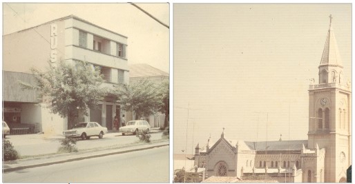 Figuras 1 e 2 – À esquerda, no segundo andar desse pequeno edifício, ao lado do Supermercado Russi, na Rua Olavo Guimarães no 281, situava a república onde residi por cerca de cinco anos e meio. À direita, a imponente Igreja da Vila Arens, vista do terraço da república.
